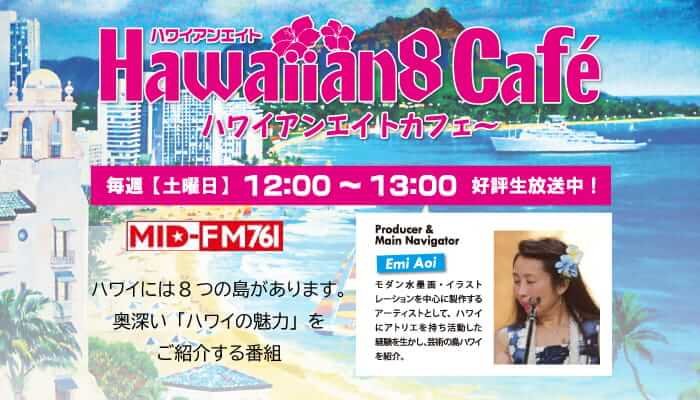 日本でもハワイの風を感じて頂けるラジオ番組、MID FMにて「Hawaiian8 cafe ハワイアンエイトカフェ~」を毎週土曜日12時より、オンエアしています。ハワイのローカルカフェに居るような雰囲気の中、ハワイの音楽や文化、癒し等を紹介しています。 インターネット、iPhone、iPod touch で全国、全世界で番組を聴くことができます。