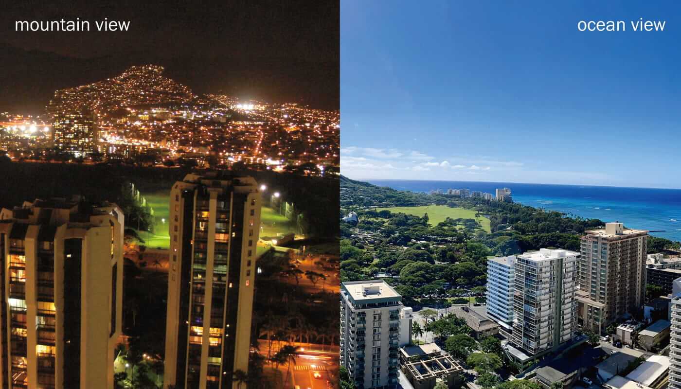 JSTハワイアンエイトでは、人気のコンドミニアム「ワイキキサンセット」の25階以上の部屋を自社所有しているため、常にお部屋からの風景を保証する旅をご案内致します。さらに30階以上のロイヤルスイートのお部屋も指定可能です。まるで宝石箱をひっくり返したかのような、夜景が美しいイルミネーションビューと、コバルトブルーの海が一面に広がるオーシャンビューの2種類のお部屋で、素敵な時間をお過ごしください。