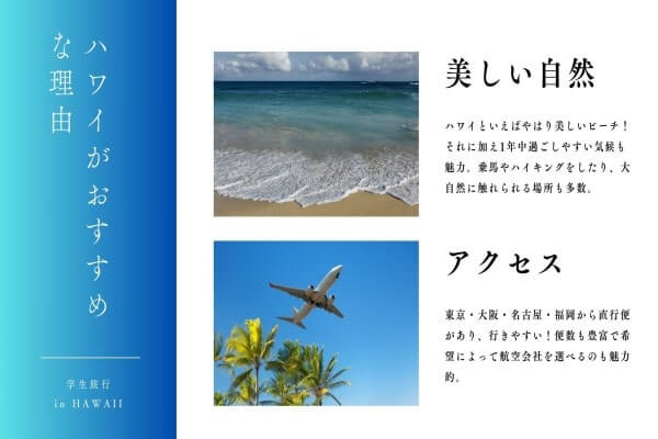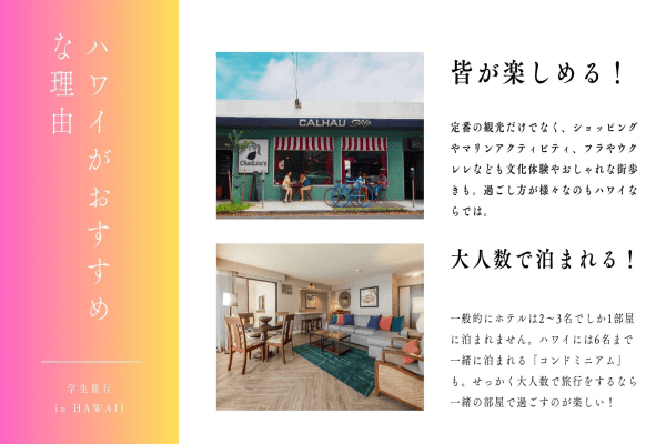 海外旅行先で人気のハワイ。社会人になってから行くハワイも良いですが、学生時代に行ってみませんか??ハワイなら自然や気候に恵まれ、日本からの飛行機も多数。観光からアクティビティ、グルメ、ショッピングと過ごし方も様々。少ない人数での旅行ももちろん楽しめますが、大人数での旅行もハワイはぴったり!夏休みや冬休み、春休みを利用すれば学校やアルバイト先のお友達との旅行も行きやすいと思います。ハワイは2泊4日間から行けますが、せっかく行くなら6日間以上がおすすめ。長ければ長いほどハワイは楽しめます。ハワイアンエイトは学生旅行、卒業旅行、グループ旅行を全力サポートします!