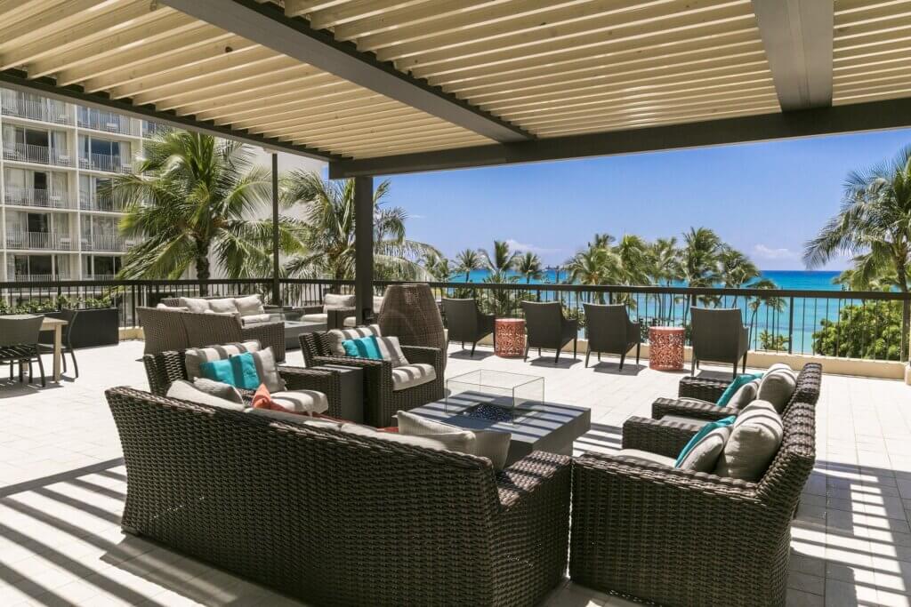 【4階のデッキ】ハワイの温かい陽射しと爽やかな風を存分に感じられるデッキは宿泊者のみが利用できる贅沢なエリア。