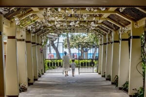 【エントランス前の通路】ビーチタワーのエントランスからカラカウア通りに抜ける通路。目に入る青い海が気分を盛り上げてくれます。