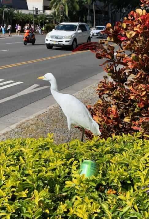 実際、ビブスを貰いに行く時に会った方(この方もランナーでした)からホノルルマラソンの歴史を教えてもらったり、通りを平気で歩いている白い鳥(調べたら『アマサギ』という鳥)や頭に赤い冠を被ったような『ネネ』。ほかに『チョウショウバト』とか、日本では絶対見ない鳥。日本でも見るようなニワトリもいましたが、皆んな逃げない❗️。この子たちの呑気さが自然の豊かさを象徴しています。