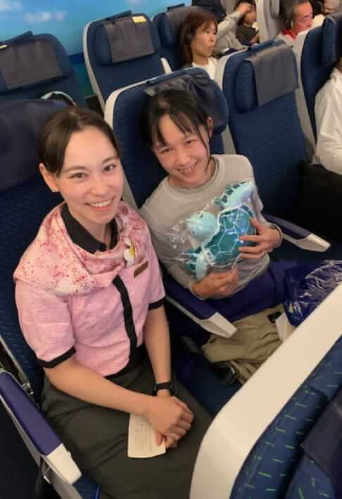 ANAのCAさんとのツーショットは機内食のハニーチキンが美味しかったことやトッピングされたソーメンがマラソンを走る時間が掛かってしまい食べられなかったがココで出た事(『天使のソーメン』ボランティアで沿道で提供されます)などをお手紙(メモ)で手渡したらお礼に来てくれたので機内販売で手に入れたホヌのぬいぐるみ(エメラルドグリーンの『カイ』くん)を抱いて並んでパチリ。